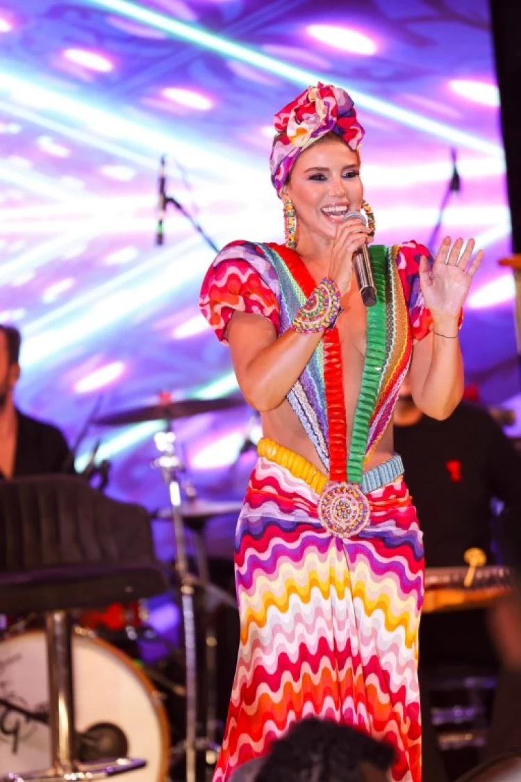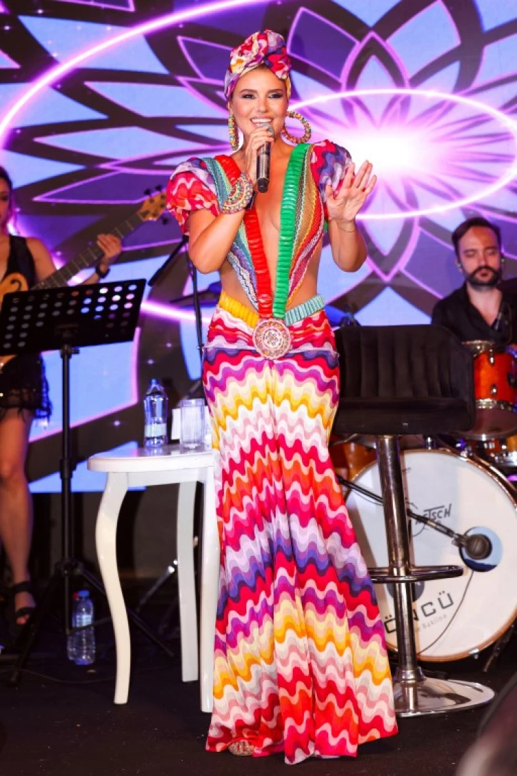 Şerefe Alaçatı sahnesinde bu gece, Gülben Ergen’in enerjisi tüm sokaklara doldu taştı. Gülşah Saraçoğlu imzalı, rengarenk ve cesur kostümüyle göz kamaştıran sanatçı, başındaki iddialı saç aksesuarıyla izleyenleri büyüledi.