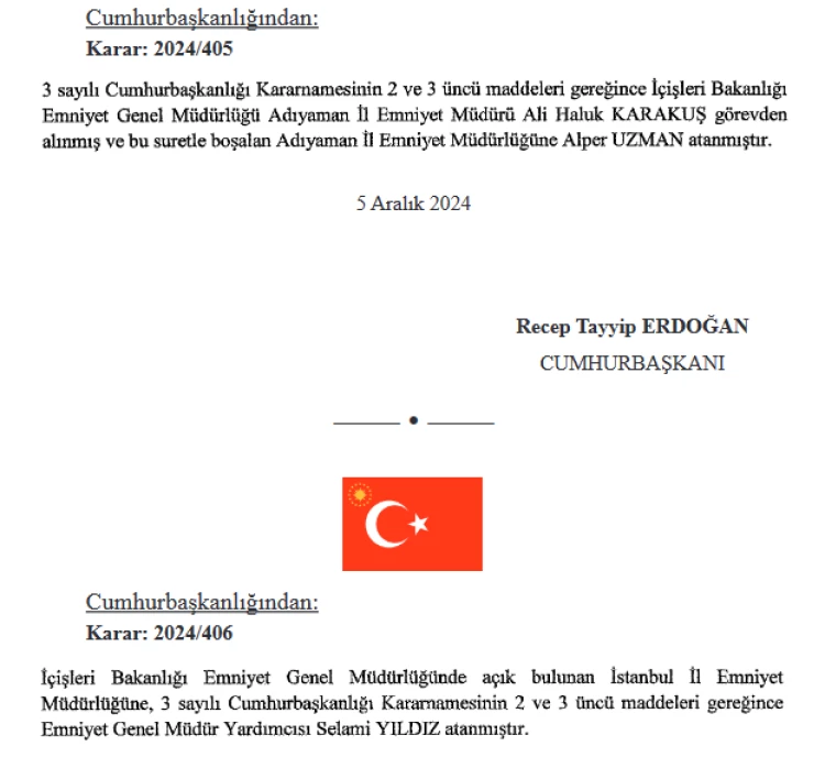 Resmi Gazete'de bugün yayımlanan Cumhurbaşkanlığı atama kararlarına göre, İstanbul İl Emniyet Müdürlüğü'ne Emniyet Genel Müdür Yardımcısı Selami Yıldız atandı. Adıyaman'da ise İl Emniyet Müdürü Ali Haluk Karakuş görevden alındı.