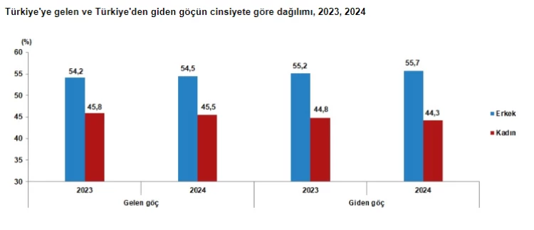 Göçmenlerin yüzde 54,5’i erkek, yüzde 45,5’i kadınlardan oluştu. Türkiye’ye gelenlerin 103 bin 732’si Türk vatandaşı, 210 bin 856’sı ise yabancı uyruklu kişilerdi. Aynı dönemde Türkiye’den yurt dışına göç edenlerin sayısı ise yüzde 40,6 azalarak 424 bin 345’e geriledi. Bu göçmenlerin yüzde 55,7’si erkek, yüzde 44,3’ü kadın, 151 bin 140’ı Türk vatandaşı, 273 bin 205’i ise yabancı uyrukluydu.