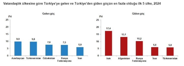 Türkiye’den göç eden yabancılar arasında ise yüzde 17,4 ile Irak vatandaşları başı çekti.
