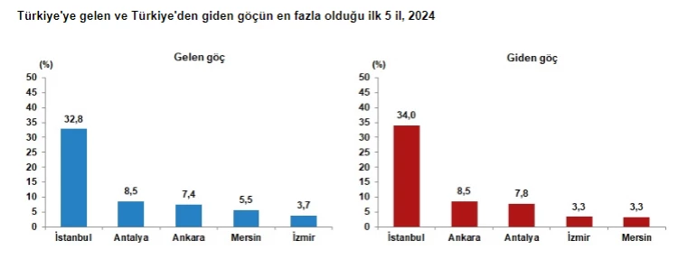 İstanbul’u yüzde 8,5 ile Antalya, yüzde 7,4 ile Ankara, yüzde 5,5 ile Mersin ve yüzde 3,7 ile İzmir takip etti. Türkiye’den en fazla göç veren il de yüzde 34 ile İstanbul olurken, onu yüzde 8,5 ile Ankara, yüzde 7,8 ile Antalya, yüzde 3,3 ile İzmir ve Mersin izledi.