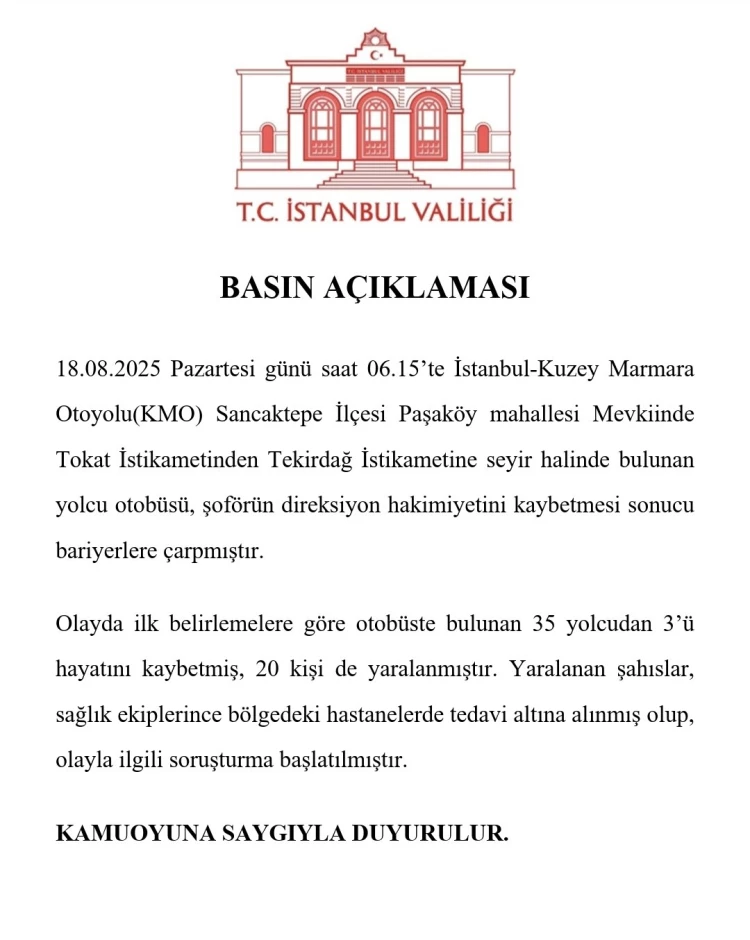 Valilikten yapılan açıklamada, Kuzey Marmara Otoyolu’nda (KMO) Sancaktepe İlçesi Paşaköy Mahallesi mevkiinde yaşanan trafik kazasıyla ilgili detayları kamuoyuyla paylaştı.