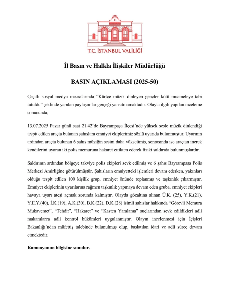 İSTANBUL (İGFA) - İstanbul Valiliği, 13 Temmuz 2025’te Bayrampaşa’da yaşanan asayiş olayıyla ilgili sosyal medyada “Kürtçe müzik dinleyen gençlere kötü muamele” iddialarının gerçeği yansıtmadığını duyurdu.