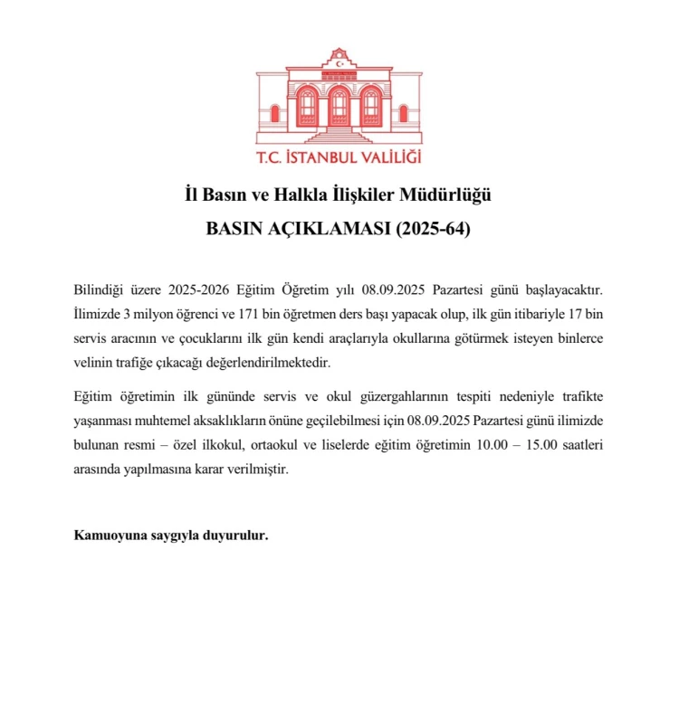 İstanbul Valiliği, 2025-2026 eğitim-öğretim yılının ilk günü olan 8 Eylül 2025 Pazartesi günü, trafik yoğunluğunu azaltmak için resmi ve özel ilkokul, ortaokul ve liselerde derslerin 10.00-15.00 saatleri arasında yapılacağını duyurdu