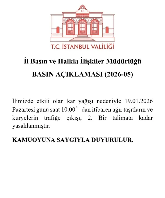 İstanbul Valiliği, etkili olan kar yağışı nedeniyle 19 Ocak Pazartesi günü saat 10.00’dan itibaren ağır taşıtlar ve kuryelerin trafiğe çıkışını ikinci bir talimata kadar yasakladı.