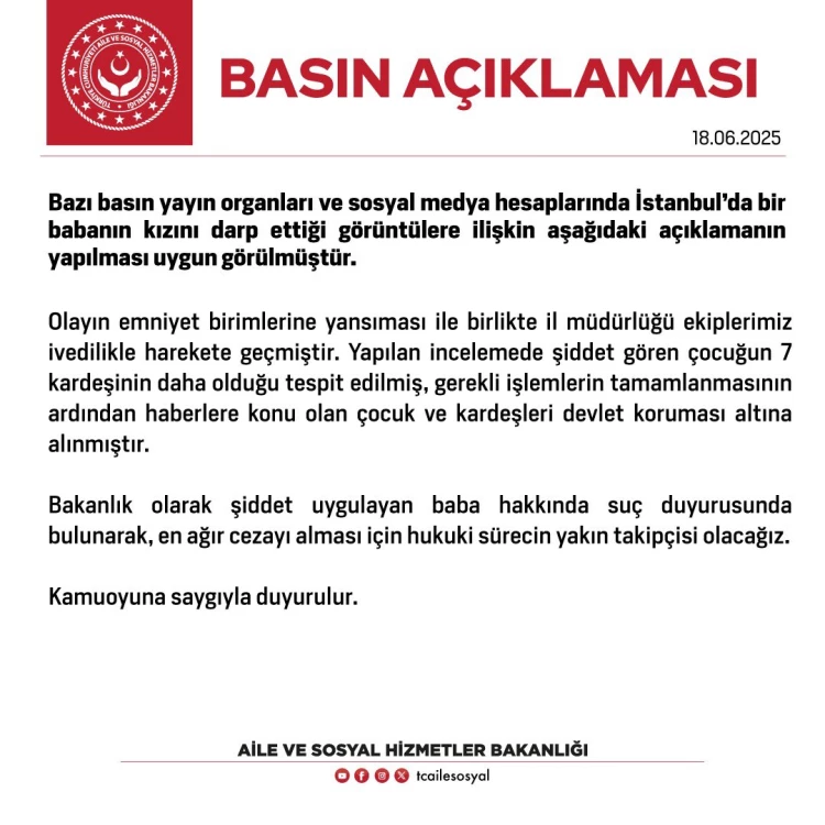 Bakanlık, şiddet uygulayan baba hakkında suç duyurusunda bulunarak, hukuki sürecin takipçisi olacağını ve babanın en ağır cezayı alması için çalışacağını açıkladı.