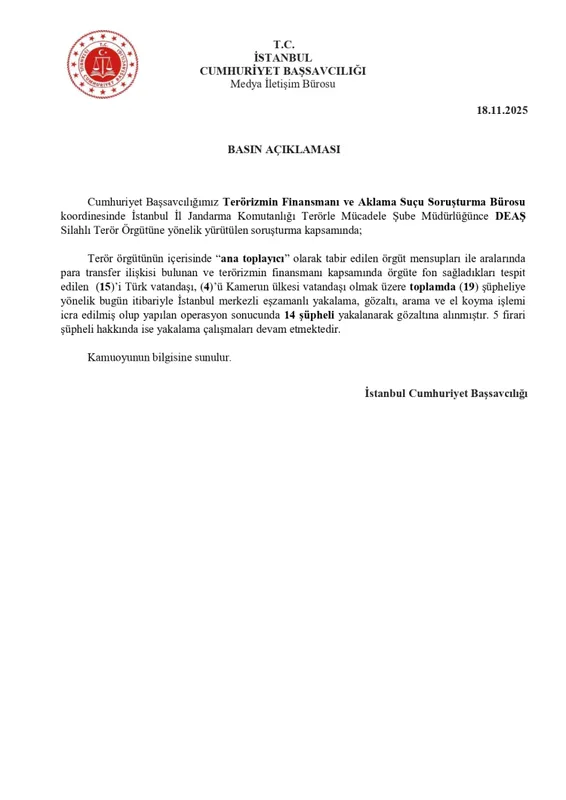 İstanbul Cumhuriyet Başsavcılığı koordinesinde, Jandarma ekiplerinin düzenlediği operasyonda DEAŞ’a finansman sağladığı tespit edilen 19 şüpheliden 14’ü gözaltına alındı, 5 şüpheli ise firari.