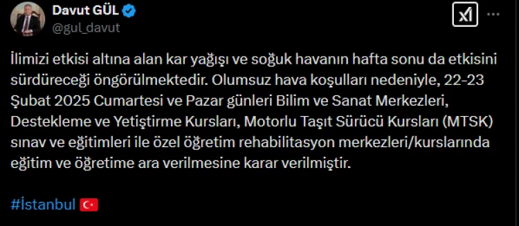 Vali Gül, yaptığı yazılı açıklamada, İstanbul'u etkisi altına alan kar yağışı ve soğuk havanın hafta sonu da etkisini sürdüreceği öngörüldüğünden dolayı, olumsuz hava koşulları nedeniyle, 22-23 Şubat 2025 Cumartesi ve Pazar günleri Bilim ve Sanat Merkezleri, Destekleme ve Yetiştirme Kursları, Motorlu Taşıt Sürücü Kursları (MTSK) sınav ve eğitimleri ile özel öğretim rehabilitasyon merkezleri/kurslarında eğitim ve öğretime ara verilmesinin kararlaştırıldığını duyurdu.