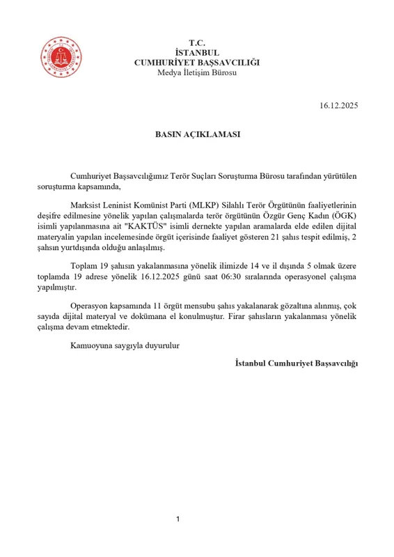 İSTANBUL (İGFA) - İstanbul Cumhuriyet Başsavcılığı Terör Suçları Soruşturma Bürosu’nca yürütülen soruşturma kapsamında, Marksist Leninist Komünist Parti (MLKP) silahlı terör örgütünün faaliyetlerinin deşifre edilmesine yönelik operasyon düzenlendi.
