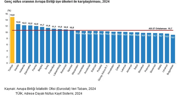 AB üyesi 27 ülkenin 2024’te ortalama genç nüfus oranı yüzde 10,7 oldu. İrlanda (yüzde 12,6), Hollanda (yüzde 12,3) ve Danimarka (yüzde 12,2) en yüksek oranlara sahipken, Bulgaristan (yüzde 9,2) ve Litvanya (yüzde 9,5) en düşük oranları kaydetti. Türkiye’nin yüzde 14,9’luk genç nüfus oranı, AB ortalamasını geçti.