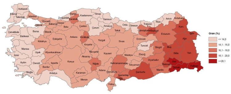 Türkiye’de genç nüfus oranı en yüksek il yüzde 20,8 ile Hakkari, ardından yüzde 20,6 ile Şırnak ve yüzde 20,3 ile Siirt oldu. En düşük oranlar ise yüzde 11,8 ile Balıkesir, yüzde 12,1 ile Muğla ve yüzde 12,2 ile Ordu’da görüldü. Gençlerin yüzde 30,5’i 15-17, yüzde 19,9’u 18-19, yüzde 28,8’i 20-22, yüzde 20,8’i 23-24 yaş grubunda yer aldı.