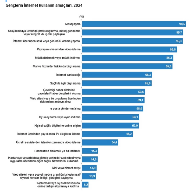 Gençlerin yüzde 79,6’sı işinden, yüzde 65,4’ü eğitiminden memnun. İnterneti en çok mesajlaşma (yüzde 98,5) ve sosyal medya (yüzde 95,7) için kullanıyorlar.
