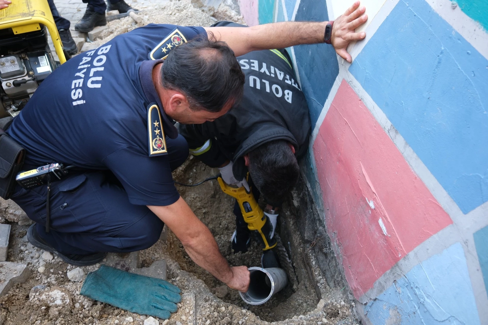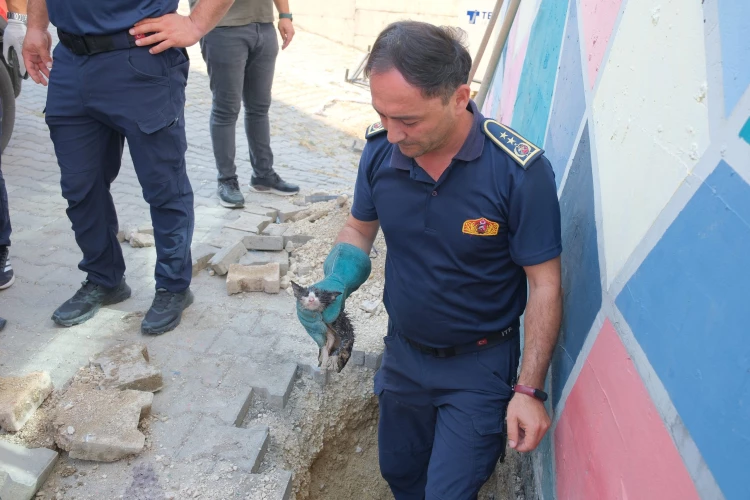 BOLU (İGFA) - Bolu iline bağlı Borazanlar Mahallesi’nde bulunan bir özel okulun önündeki borudan içeri düşen yavru kedi, civarda bulunan duyarlı bir vatandaşın belediyeye haber vermesi üzerine kurtarıldı. 1 buçuk metrelik derinlikte sıkışıp kalan yavru kediyi kurtarmak için seferber olan ekipler, öncelikle borunun üzerindeki betonu kırdı. Ardından itfaiye aracında hazır bulunan elektrikli kesim motoruyla boru kesildi ve yavru kedi sağ salim çıkartıldı.