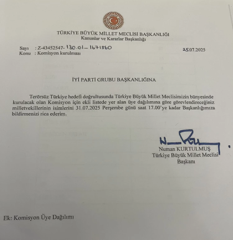 İYİ Parti Genel Başkanı Müsavat Dervişoğlu, TBMM Başkanı’nın çağrısıyla kurulacak komisyonun belirsiz amaç ve işleyiş kuralları nedeniyle İYİ Parti’nin bu komisyonda yer almayacağını açıkladı. Dervişoğlu, komisyonun İmralı ve terör örgütü taleplerini meşrulaştırabilecek faaliyetlere zemin hazırlayabileceği endişesini vurguladı.