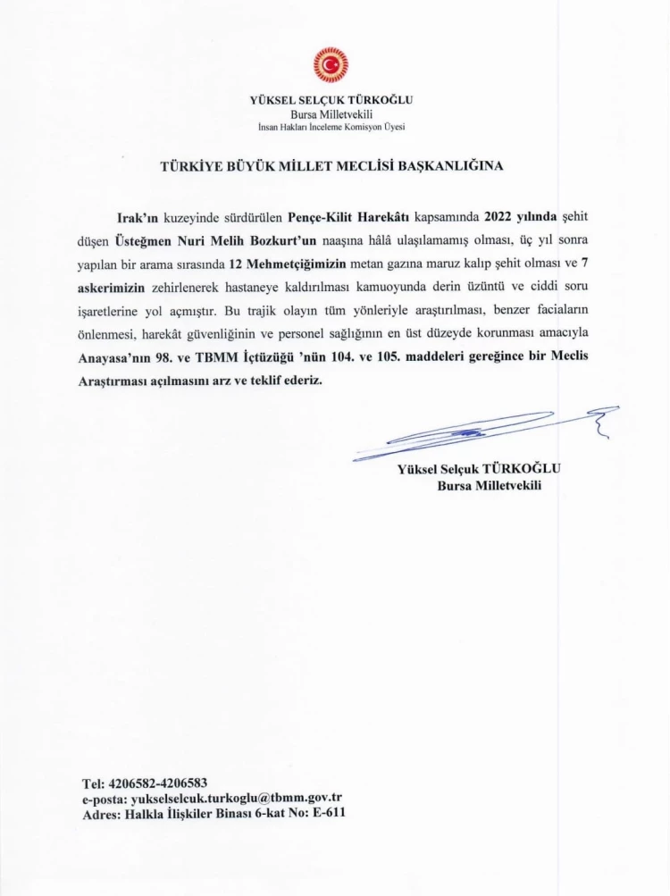 Irak’ın kuzeyindeki Pençe-Kilit Harekâtı’nda, metan gazına maruz kalarak 12 askerin şehit olduğu olay, İYİ Parti Bursa Milletvekili Selçuk Türkoğlu tarafından TBMM gündemine taşındı. Türkoğlu, ihmaller zincirini sorgulayan 14 soruluk önerge ve Meclis araştırma talebiyle, facianın aydınlatılmasını istedi.