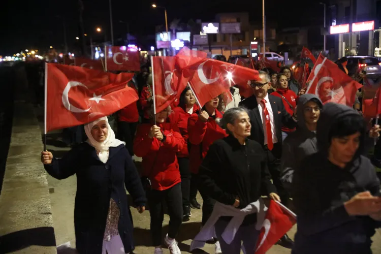 İZMİR (İGFA) - Güzelbahçe Maltepe Mahallesi Tabaoğlu Parkı’nda toplanan Cumhuriyet sevdalısı yüzlerce Güzelbahçeli, ellerinde meşale ve Türk Bayrakları’yla yaklaşık iki kilometre sahil boyunca yürüdü.