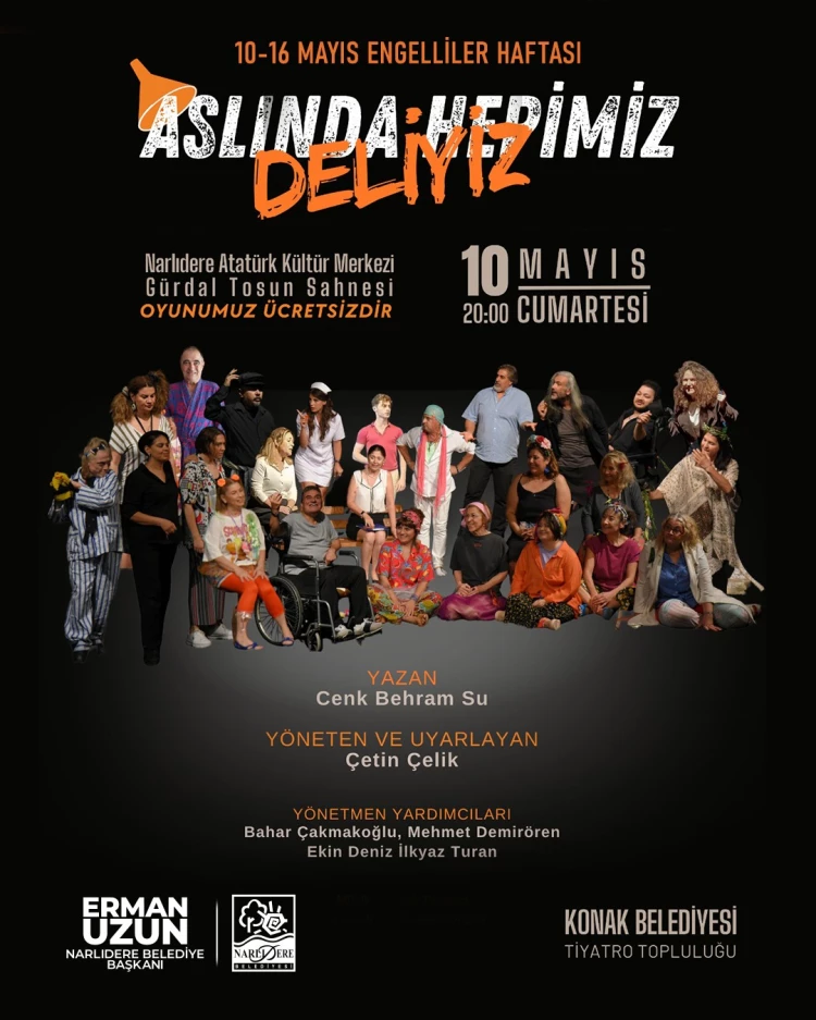 İZMİR (İGFA) - İzmir Narlıdere Belediyesi, 10-16 Mayıs Dünya Engelliler Haftası kapsamında farkındalık yaratmak, eşit yaşam hakkına dikkat çekmek ve engelli bireylerin başarı hikâyelerini görünür kılmak amacıyla iki özel etkinlik düzenleyecek. Engelliler Haftası etkinliklerinin ilki, 10 Mayıs Cumartesi günü saat 20.00’de Atatürk Kültür Merkezi Tiyatro Salonu’nda sahnelenecek olan “Aslında Hepimiz Deliyiz” adlı tiyatro oyunu olacak. Konak Belediyesi Tiyatro Topluluğu’nun sahneleyeceği oyun öncesinde, kendisi de engelli bir birey olan Erkan Kızıldağ, engelli bireylerin yaşadığı sorunları anlatan bir konuşma yapacak.