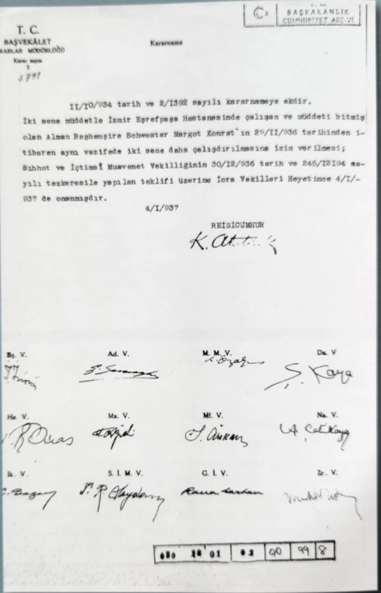 İki sene boyunca Eşrefpaşa Hastanesi’nde görev alan Alman hemşire Margot Konrat’ın çalışma izninin uzatılmasına ilişkin 1934 ve 1937 tarihli ve dönemin Cumhurbaşkanı Mustafa Kemal Atatürk imzalı iki belge, Başkan Tugay’a takdim edildi.