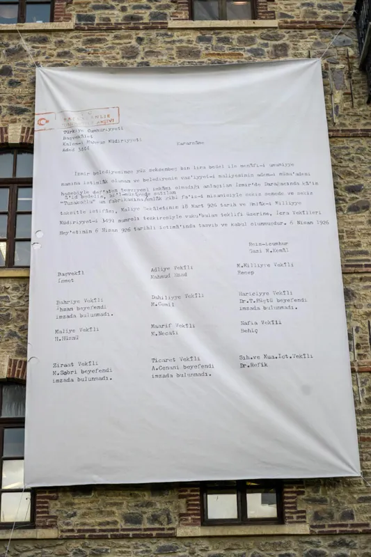 İZMİR (İGFA) - Meslek Fabrikası olarak hizmet veren binanın 1926 yılında Gazi Mustafa Kemal Atatürk’ün imzaladığı kararnameyle İzmir Büyükşehir Belediyesi mülkiyetine geçtiğini gösteren resmi belgelere ait görseller tarihi yapının duvarlarına asıldı.