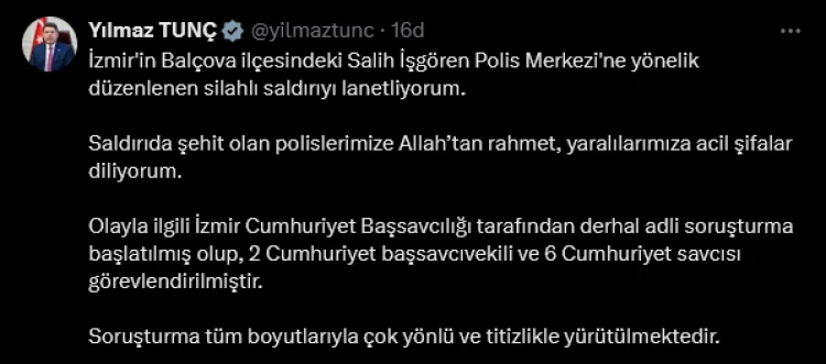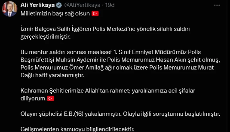 İçişleri Bakanı Ali Yerlikaya, İzmir Balçova’daki Salih İşgören Polis Merkezi’ne düzenlenen silahlı saldırıda Emniyet Müdürü Muhsin Aydemir ve Polis Memuru Hasan Akın’ın şehit olduğunu, iki polisin yaralandığını açıkladı. Adalet Bakanlığı, 16 yaşındaki saldırgan şüpheli E.B.'nin yakalandığını ve soruşturmanın çok yönlü olarak başlatıldığını duyurdu.