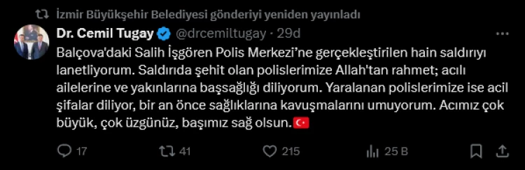 İzmir Büyükşehir Belediye Başkanı Cemil Tugay, Balçova'daki Salih İşgören Polis Merkezi’ne gerçekleştirilen hain saldırıyı kanetlerken, "Saldırıda şehit olan polislerimize Allah'tan rahmet; acılı ailelerine ve yakınlarına başsağlığı diliyorum. Yaralanan polislerimize ise acil şifalar diliyor, bir an önce sağlıklarına kavuşmalarını umuyorum. Acımız çok büyük, çok üzgünüz, başımız sağ olsun" mesajını paylaştı. Büyükşehir Belediyesi, saldırı dolayısıyla 9 Eylül akşamı yapılması planlanan resepsiyonun iptal edildiğini duyurdu.