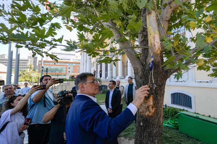 İzmir Büyükşehir Belediye Başkanı Dr. Cemil Tugay, Konak Atatürk Meydanı’nda kırılan asırlık çınar ağacının yerine 35 yaşındaki doğu çınarını dikti. İlk suyunu bAŞKAN Tugay’ın verdiği ağaca nazar boncuğu takıldı.