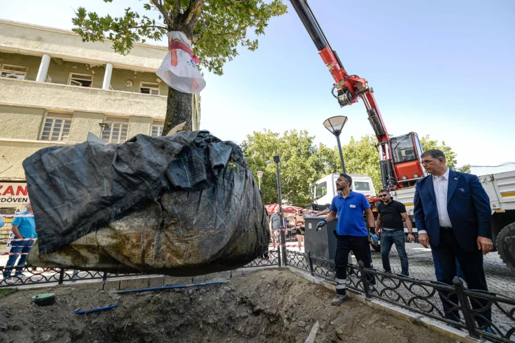 İZMİR (İGFA) - İzmir Büyükşehir Belediye Başkanı Dr. Cemil Tugay, Konak Atatürk Meydanı’nda, Kemeraltı Çarşısı girişinde geçtiğimiz günlerde gövdesinden kırılarak devrilen asırlık çınar ağacının yerine yeni bir doğu çınarı (Platanus Orientalis) dikti.