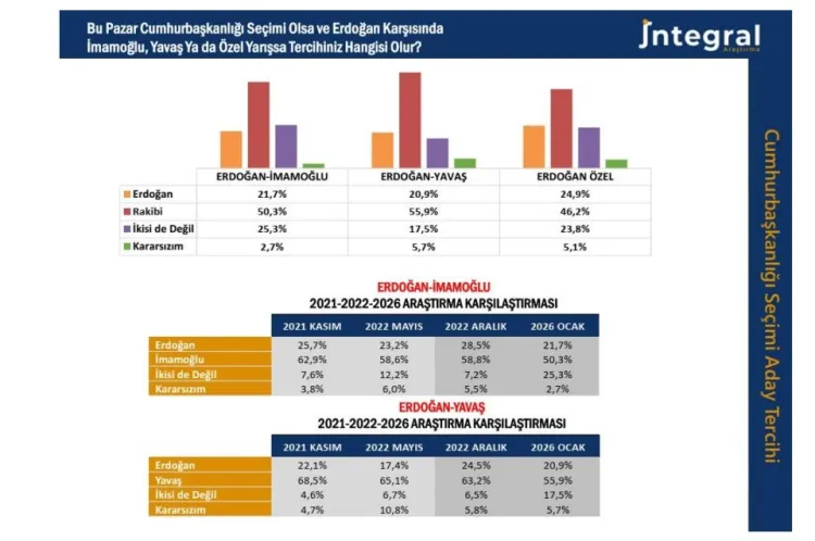 İntegral Araştırma son 4 yıl boyunca yaptığı araştırmalarla karşılaştırıldığında Erdoğan ile CHP’nin olası adayları senaryoları için en kritik bulgunun “İkisi de değil, Kararsızım” seçeneklerindeki artış olduğunu açıkladı. Bu artışın hem iktidar hem muhalefet cephesindeki yorgunluk kadar seçmenin yeni yol, yeni aday arayışı ve de özellikle İstanbul merkezli yürütülen soruşturmalarla açıklanabileceği vurgulandı.