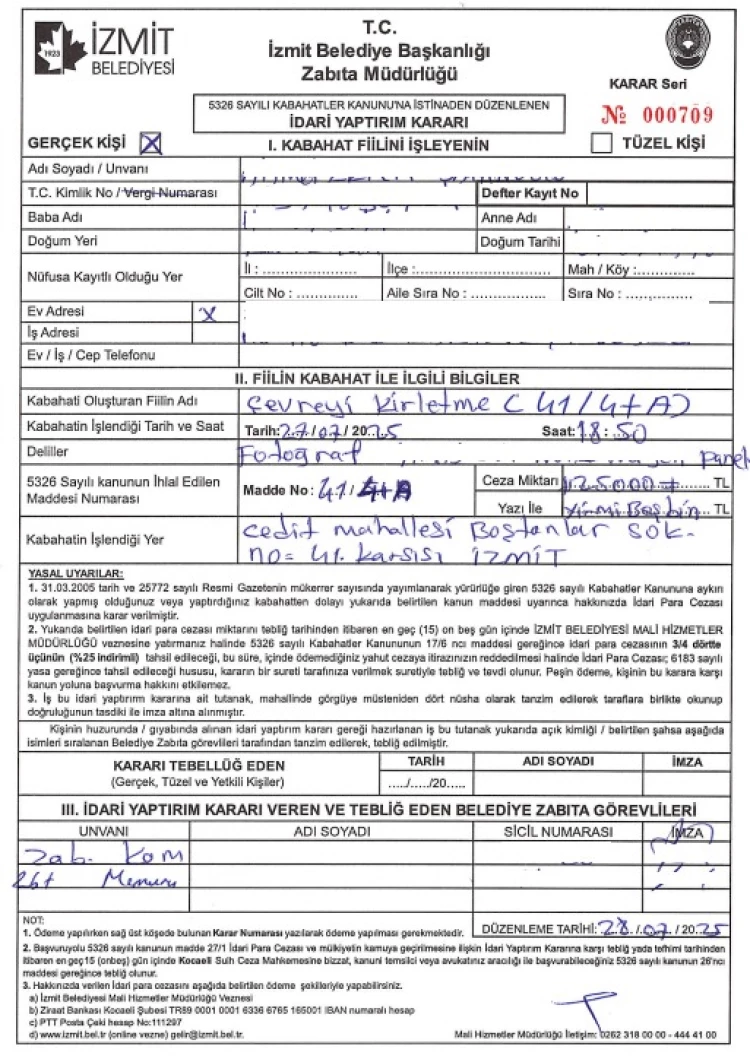 Kocaeli'nin İzmit ilçesinde Cedit Mahallesi’nde başka bir bölgeden getirilen inşaat atıklarının çöp konteyneri yanına döküldüğü ihbarı üzerine harekete geçen İzmit Belediyesi, çevre kirliliğine neden olan kişiye 25 bin TL ceza uyguladı