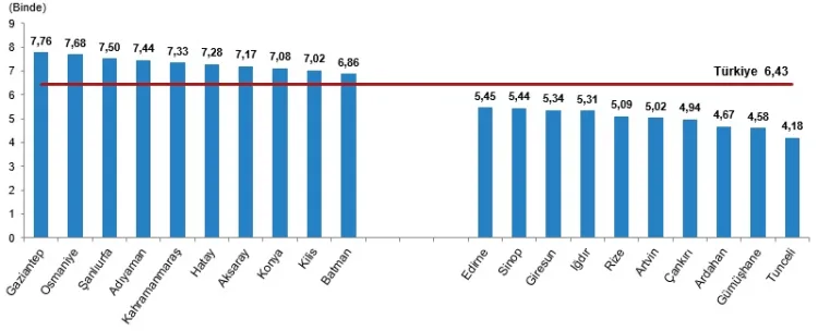 Kaba evlenme hızının en yüksek olduğu iller: Gaziantep (binde 7,76), Osmaniye (binde 7,68), Şanlıurfa (binde 7,50).