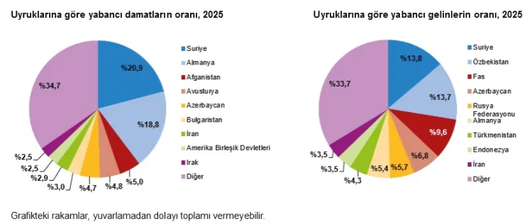 Yabancı damatlar arasında Suriyeliler yüzde 20,9, Almanlar yüzde 18,8 ve Afganlar yüzde 5,0 ile öne çıktı. Yabancı gelinlerde ise Suriyeliler yüzde 13,8, Özbekler yüzde 13,7 ve Faslılar yüzde 9,6 olarak kaydedildi.