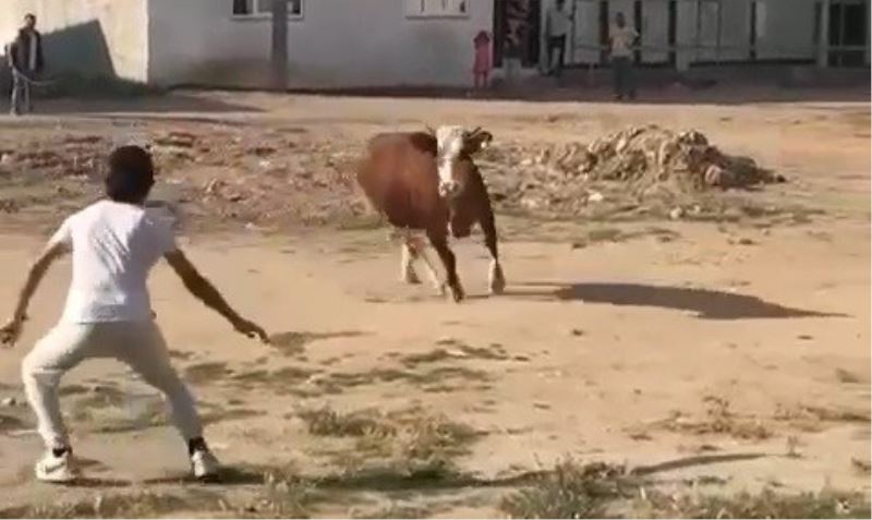 Olay, Arabayatağı Mahallesi’nde meydana geldi. Sahibinin tuttuğu iplerden kurtulan kurbanlık boğa vatandaşların üzerine doğru koşmaya başladı. Boğanın üzerine koştuğunu gören vatandaşlar panikle sağa sola kaçıştı. Otluk alana kaçan boğa olay yerine gelen veteriner tarafından uyuşturucu iğne atılıp sakinleştirildikten sonra yakalanabildi. Sahibinin elinden kaçan kurbanlık boğanın sebep olduğu panik anları ve vatandaşların boğadan kaçtığı anlar cep telefonu kamerasına yansıdı.