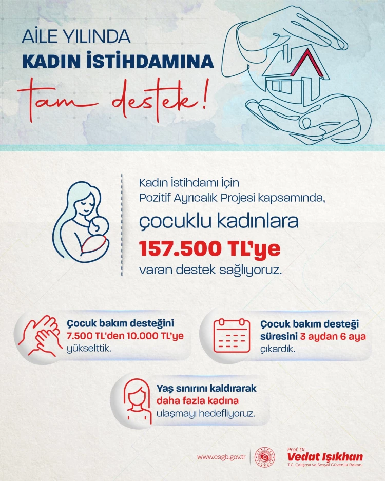 Çalışma ve Sosyal Güvenlik Bakanı Vedat Işıkhan, Kadın İstihdamı İçin Pozitif Ayrıcalık Projesi kapsamında çocuklu kadınlara 157 bin 500 TL’ye kadar destek sağlanacağını duyurdu. Çocuk bakım desteği 7 bin 500 TL’den 10 bin TL’ye, süre ise 3 aydan 6 aya uzatıldı ve yaş sınırı kaldırıldı.