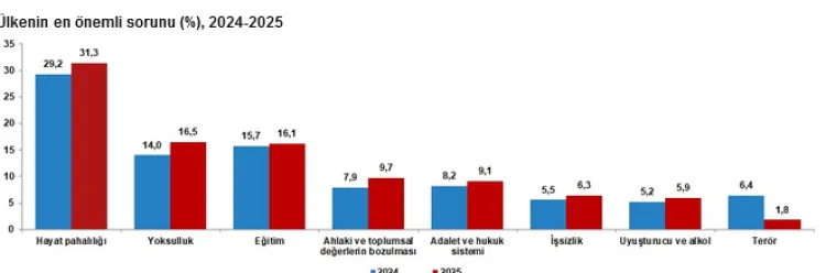 Araştırmaya göre, 2025 yılında toplumun en önemli sorunu hayat pahalılığı (yüzde 31,3) olarak öne çıktı.