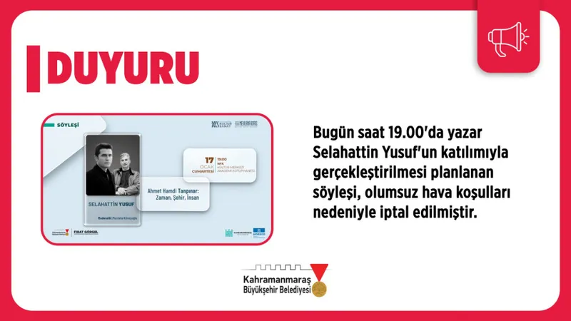Kahramanmaraş Büyükşehir Belediyesi, Mevlâna İdris Kültür Sanat Sezonu kapsamında 17 Ocak Cumartesi günü saat 19.00'da düzenlemeyi planladığı edebiyat söyleşisini iptal etti. Belediye, hava muhalefeti nedeniyle bu kararı aldığını duyurdu.