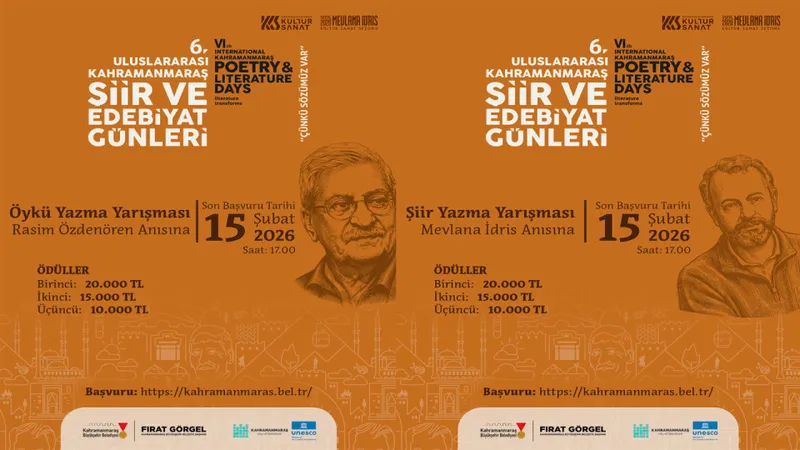 Kahramanmaraş Büyükşehir Belediyesi, bu yıl altıncısı düzenlenecek Uluslararası Kahramanmaraş Şiir ve Edebiyat Günleri kapsamında Türkiye geneli şiir ve öykü yazma yarışmaları başlattı. Yarışmaya ilişkin detaylı bilgi ve başvuru formuna belediyenin internet adresinden ulaşılabiliyor.