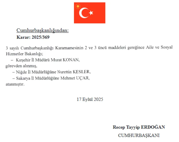 Cumhurbaşkanı Erdoğan'ın imzasıyla kamuda yeni atamalar yapıldı. Aile ve Sosyal Hizmetler Bakanlığı'na il müdürlükleri bazında ise Kırşehir görevden alınırken, Niğde ve Sakarya'ya yeni il müdürleri atandı.