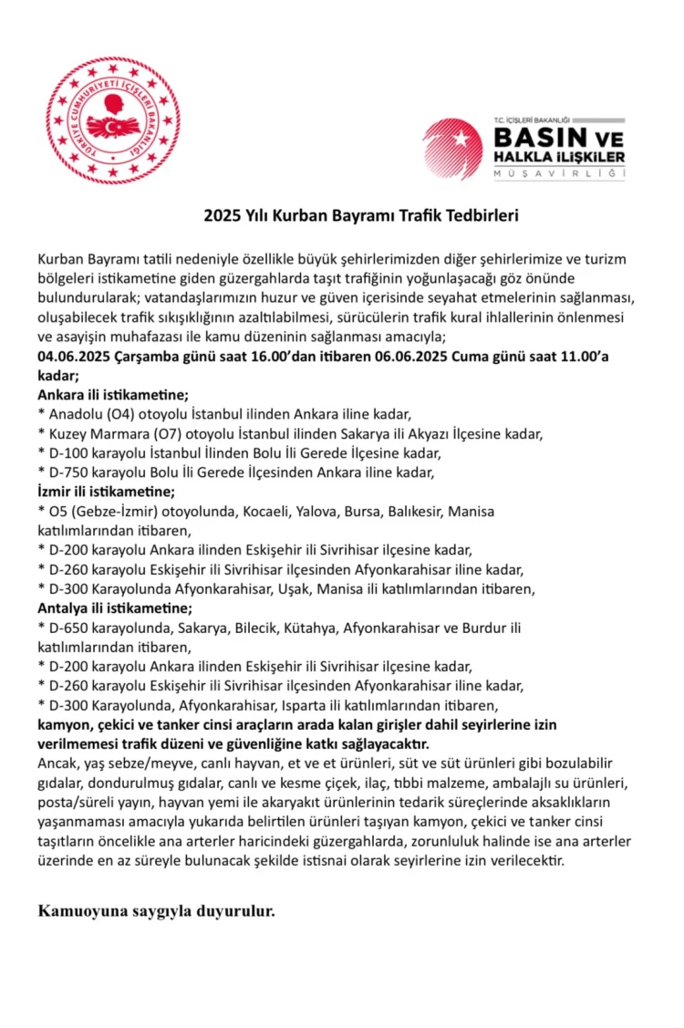 ANKARA (İGFA) - İçişleri Bakanlığı, Kurban Bayramı tatili nedeniyle artan trafik yoğunluğunu azaltmak ve vatandaşların güvenli seyahat etmesini sağlamak amacıyla 4 Haziran 2025 Çarşamba saat 16.00’dan 06 Haziran 2025 Cuma saat 11.00’e kadar bazı güzergâhlarda kamyon, çekici ve tanker tipi araçların seyirlerine kısıtlama getirildiğini duyurdu.