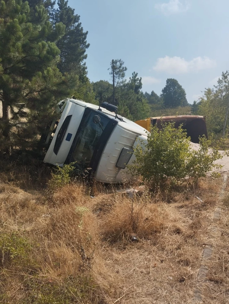 DÜZCE (İGFA) - Yerleşim alanı ve diğer araçların bulunduğu bölgede kontrolü kaybeden sürücü, ani bir kararla direksiyonu dağ tarafına çevirerek kamyonun devrilmesini sağladı. Devrilme sonucu kamyonun kasasındaki kum yola saçıldı.