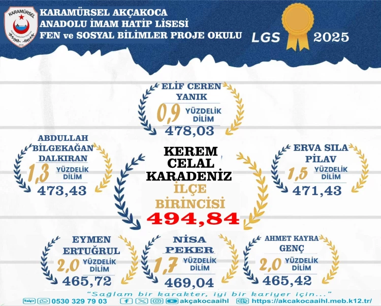 LGS sınav sonuçlarına göre Karamürsel ilçe birinciliğini elde eden Kerem Celal Karadeniz’in yanı sıra yine Karamürsel Akçakoca Anadolu İmam Hatip Lisesi Fen ve Sosyal Bilimler Ortaokulundan; Elif Ceren Yanık 478.03 puan ile yüzde 0.9 dilime, Abdullah Bilgehan Dalkıran 473.41 puan ile yüzde 1.32 dillime, Erva Sıla Pilav 471.43 puan ile yüzde 1.5 dilime, Nisa Peker 469.04 puan ile yüzde 1.7 dilime, Eymen Ertuğrul 435.72 puan ile yüzde 2 dilime ve Ahmet Kayra Genç 465.421 puan ile yüzde 2’lik dilme girdi.