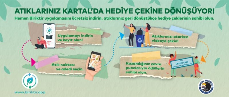Kartal Belediyesi çevre bilinci ve duyarlılığını artırmak için Kartal’da atıkların geri kazandırılmasına yönelik “Biriktir” uygulaması ile atıkları hediye çekine dönüştürüyor.