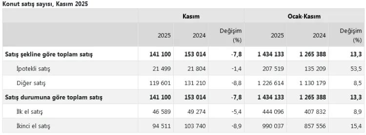 Ocak-Kasım döneminde toplam konut satışları yüzde 13,3 artışla 1 milyon 434 bin 133’e yükseldi. Bu dönemde ipotekli satışlar 207 bin 519’a ulaşırken, Kasım ayında ipotekli satışlar yüzde 1,4 düşerek 21 bin 499 oldu ve toplam satışların yüzde 15,2’sini oluşturdu.