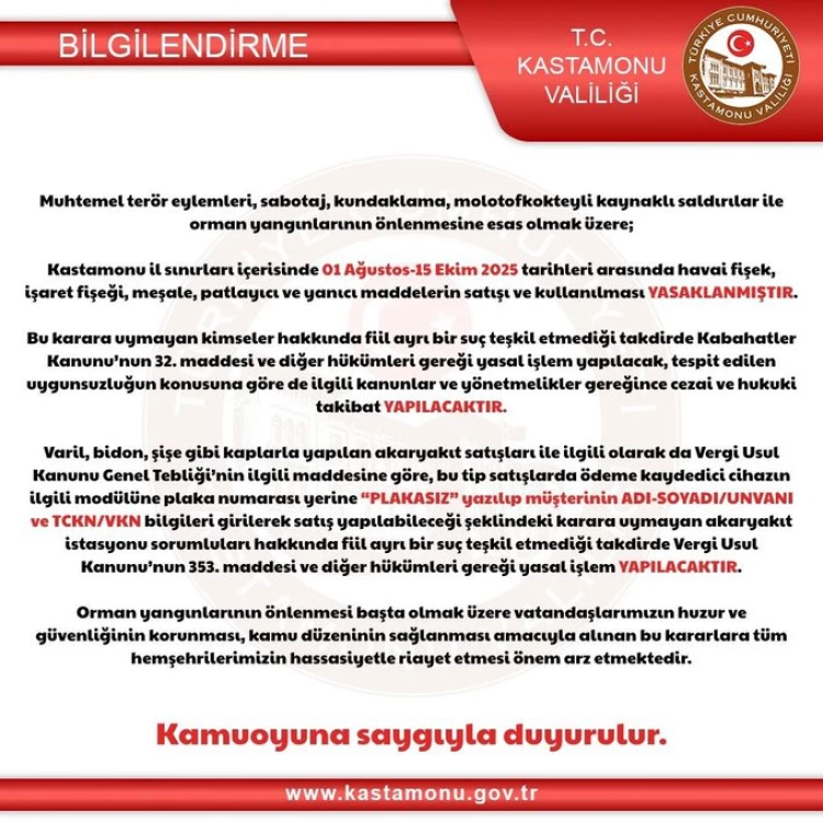 Muhtemel terör eylemleri, sabotaj, kundaklama, molotofkokteyli ve orman yangınlarını önlemek amacıyla 15 Ekim'e kadar havai fişek, işaret fişeği, meşale, patlayıcı ve yanıcı maddelerin satış ve kullanımını yasaklayan Kastamonu Valiliği, ayrıca, bidon ve şişe gibi kaplarla akaryakıt satışlarında bilgilerin kaydedilmesi zorunluluğunu getirdi.