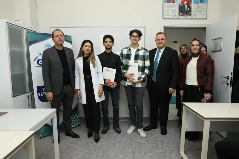 KAYMEK'te Almanca A2 kursuna katılan Muhammed Ali Coşkun ve Emir Talha Özsay, sınavlardaki başarılarıyla belge almaya hak kazanan kursiyerler arasında yer aldı. Başarılı kursiyerler, Kayseri Büyükşehir Belediye Başkanı Dr. Memduh Büyükkılıç ve KAYMEK eğitimcilerine teşekkür etti.