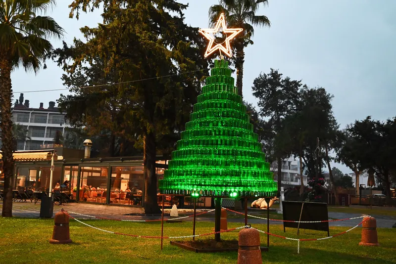 Kemer Belediyesi İklim Değişikliği ve Sıfır Atık Müdürlüğü, çevre temizliği ve geri dönüşüm konusunda farkındalık yaratmak amacıyla cam şişelerden bir yılbaşı ağacı tasarladı. Ağaç, büyük ilgi görüyor.