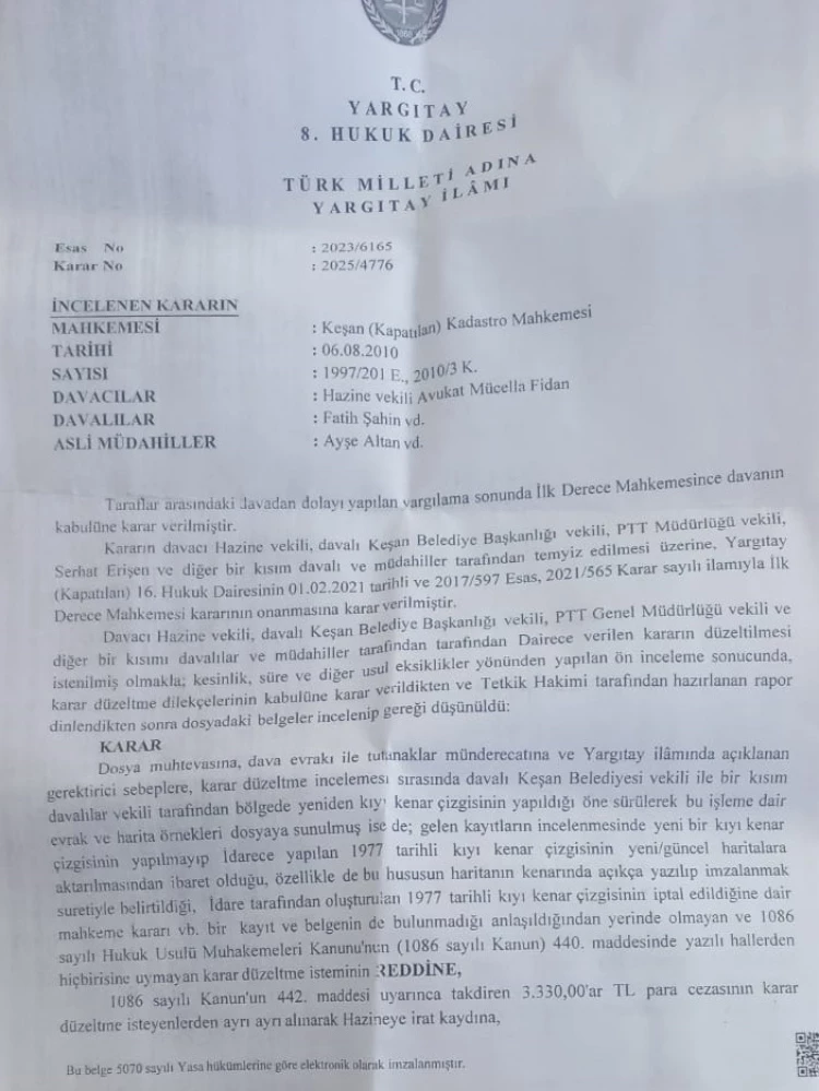 Yargıtay 8. Hukuk Dairesi, Keşan Erikli’deki kıyı kenar çizgisi kadastro davasında yerel mahkemenin kararını onadı. Davalıların karar düzeltme talepleri reddedilirken, 3 bin 330 TL para cezası kesildi.