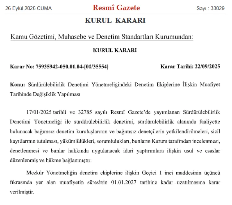 Kamu Gözetimi, Muhasebe ve Denetim Standartları Kurumu (KGK), Sürdürülebilirlik Denetimi Yönetmeliği’nde denetim ekiplerine ilişkin muafiyet tarihini değiştirdi. Muafiyet süresi 1 Ocak 2027 tarihine uzatıldı.