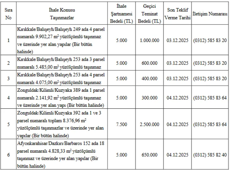 Kırıkkale’deki taşınmazlar için son teklif verme tarihi 3 Aralık 2025, Zonguldak ve Afyonkarahisar’daki taşınmazlar için ise 4 Aralık 2025 olarak belirlendi.