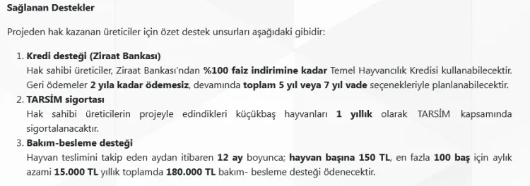 Buna göre Ziraat Bankası aracılığıyla yüzde 100’e kadar faiz indirimli kredi, 2 yıla kadar geri ödemesiz, toplam 5 veya 7 yıl vadeli kredi seçeneği, 1 yıllık TARSİM sigortası, 12 ay boyunca hayvan başına aylık 150 TL bakım-besleme desteği (Yıllık toplam 180 bin TL destek) olacak.