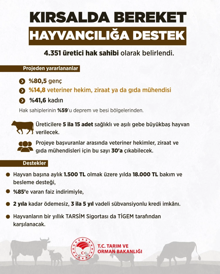 Hayvan başına aylık bin 500 TL olmak üzere yılda 18 bin TL bakım ve besleme desteği, yüzde 85'e varan faiz indirimiyle 2 yıla kadar ödemesiz, 3 ile 5 yıl vadeli sübvansiyonlu kredi imkanınına olacak.